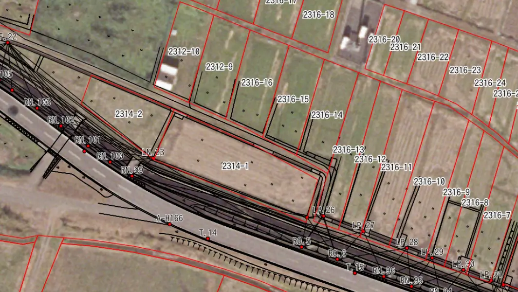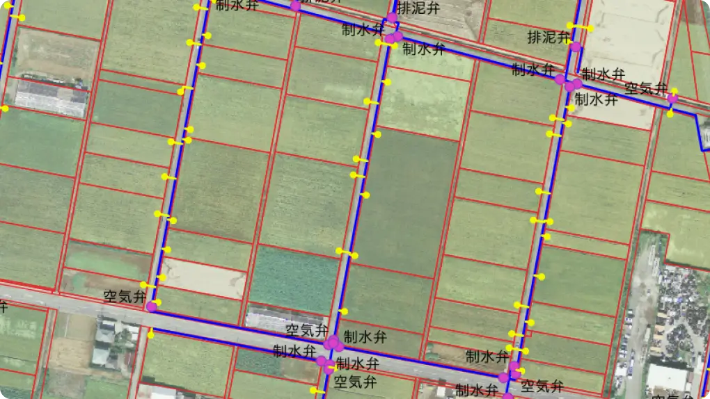 農地内に埋設された用水管の位置を把握できます。施設の施工年度の情報から、効率的な更新工事計画を作成することが可能です。